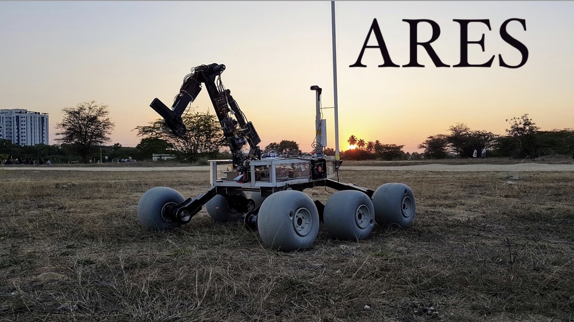Ares was the team's debut rover in the University Rover Challenge held in 2018. The main objective while designing Ares was to simplify the design, have onboard backup systems and ease of control to make sure tasks are completed with ease. With a chassis designed with a factor of safety of about 3 and a three rocker suspension system, the rover could traverse extreme martian terrain with ease. The rover was also equipped with a state of the art science system employing site selection and documentation, sensor data acquisition, sample caching and laboratory analysis. With all these features, the rover was fully equipped to assist astronauts on martian missions and proved itself in competition.